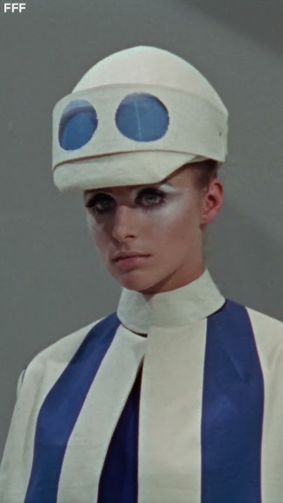 一番手前の女性のジャケットは2色で対照性を際立たせています。この配色と帽子の2つの丸(ゴーグル風)からアンドレ・クレージュを模したように思えます(ズボンなのでアンドレ・クレージュじゃないとも言えますが)。映画の前半に出てくるヴェルーシュカ・フォン・レーンドルフは1960年代にツィギーのライバルとされていたようです(アントニオ・マンチネッリ『ファッション・ボックス』292頁)。
