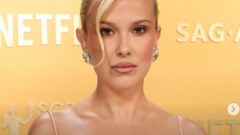 エリザベス・オルセンは、Swarovski by Giovanna Engelbertの黒いストラップレスドレスを着用。ドレスはシンプルな黒のボディコンシルエットですが、肩から首元にかけて大量のクリスタル(Swarovskiのシグネチャー)が散りばめられたネックレスとショルダーアクセサリーが目立ち、輝きを放っています。アクセサリーは滴るようなクリスタルの連なりで、イベントの「光のマスター」というテーマにぴったりマッチ。イヤリングも長めのクリスタルタイプで、全体的にエレガントで華やかな印象です。ヘアスタイルは肩までかかるストレートのブラウンヘアに軽いウェーブを入れ、前髪をサイドに流したナチュラルなもの。メイクはナチュラルで、グリーンの瞳が際立つアイメイクとヌードカラーのリップが施されています。