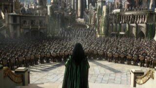 • ビジュアル・デザイン…ヘラの黒いボディスーツと触角のような兜は、彼女の戦闘能力を視覚的に強化します。特に、兜をかぶるシーンや、剣を生成する際のポーズは、彼女のカリスマ性と威圧感を際立たせます。ケイト・ブランシェットの演技も、ヘラの戦闘に感情的な重みを加え、単なる暴力以上の深みを与えています。