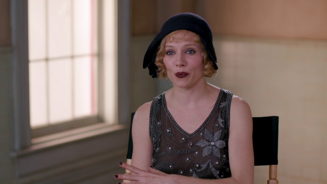 エマの衣装は、ギャングの情婦らしい華やかさとセクシーさが際立つデザインです。光沢のあるサテンのドレスや、肩を露出したイブニングガウンが彼女の魅力を引き立てます。特に、賭博場でのシーンでは、深紅のドレスが彼女の危険な魅力を象徴。化粧は、濃いアイラインと赤いリップで妖艶さを強調し、1920年代のフラッパースタイルを彷彿とさせます。髪型は、短めのボブにきついウェーブを施したスタイルで、時代感とエマの奔放な性格を表現。アクセサリーとして、長いパールのネックレスや羽飾りが使用され、豪華さを加えています。