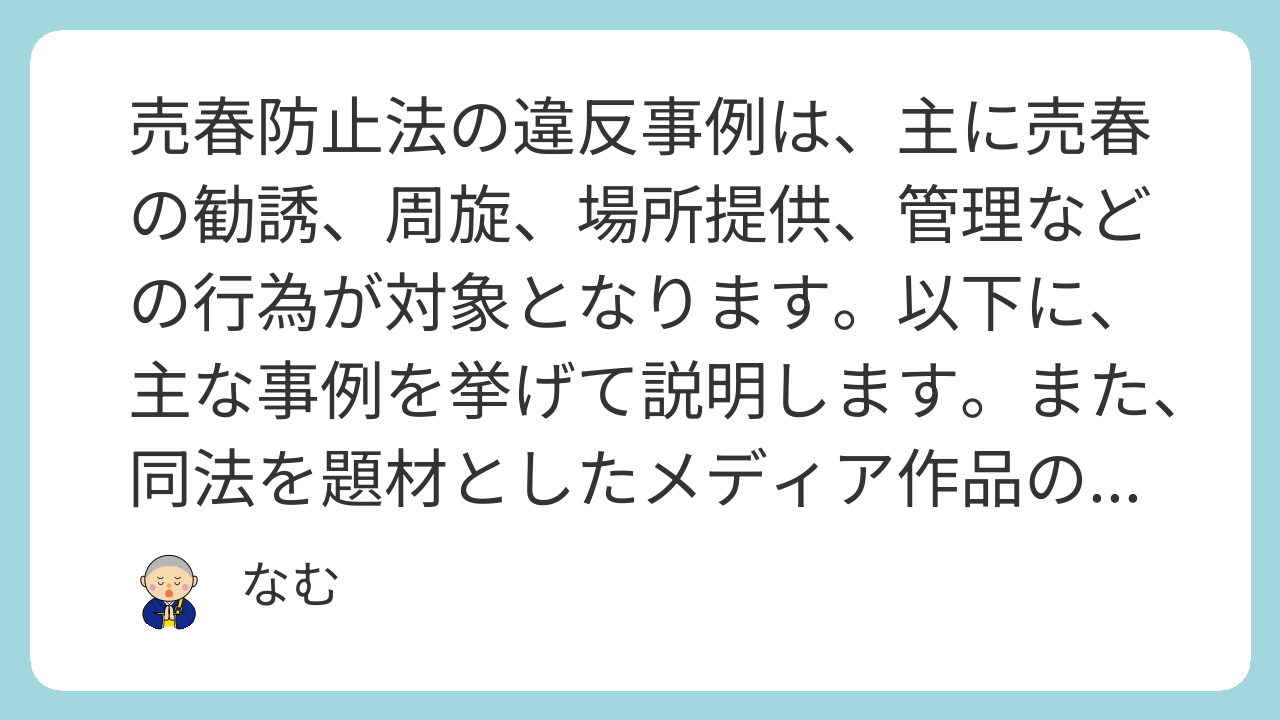 これらの違反事例から、売春防止法は売春行為そのものではなく、周囲の助長行為を対象としていることがわかります。罰則は、勧誘で6月以下の懲役または1万円以下の罰金、周旋で3年以下の懲役または10万円以下の罰金、管理売春で7年以下の懲役および30万円以下の罰金などです。事例の多くは、経済的な困窮や業界の慣習が背景にあり、社会的な支援の必要性を示しています。全体として、法律の施行以来、検挙件数は減少傾向ですが、形態の変化に対応した改正が求められています。