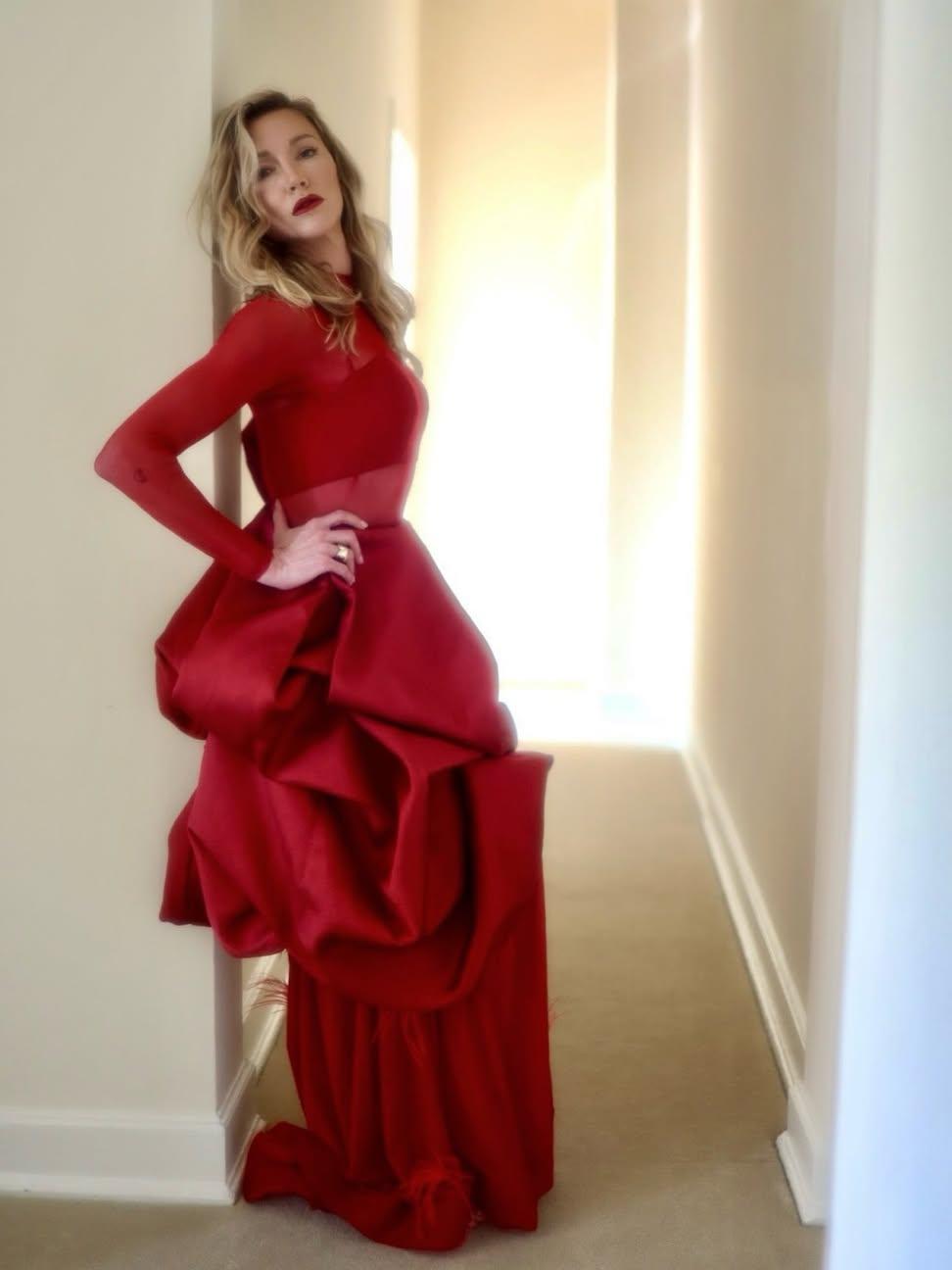 このドレスは、Oscar de la RentaやCarolina Herreraのようなデザイナーの影響を感じさせる、ドラマチックなイブニングウェア。ラッフルとボリュームは、2020年代のトレンドである「statement skirt」を反映し、ポストパンデミック期の華やかな復活を象徴します。ホリデーシーズン向けに、赤のモノクロームで統一感を出しており、ミニマリズムとエクストラバガンスのバランスが取れています。もしデザイナーが特定されていない場合(投稿に明記なし)、カスタムピースやRikki Menlo(スタイリスト?)とのコラボの可能性があります。