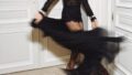 ファッションの詳細は、シュミーズの繊細な生地とレザーのコントラストが印象的です。色調はダークで、ブラック中心です。スタイルはセクシーで、ボディラインを強調します。アクセサリーは最小限です。ポーズはダイナミックで、表情は魅力的です。設定は屋内で、柔らかな照明がムードを高めています。背景にテキストがあり、投稿の統一感を保っています。