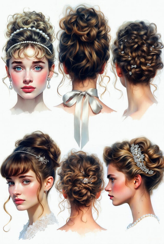 もう一つの定番はシニヨンで、低い位置でお団子状にまとめるものです。髪をポニーテールにし、くるくると巻いて固定します。アクセサリーとしてリボンやパールを加えると、洗練された雰囲気が増します。女優のオードリー・ヘプバーンが『ティファニーで朝食を』(1961年)で披露したアップヘアは、このシニヨンのバリエーションで、黒いドレスにマッチしたエレガントな例です。